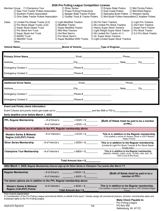 The member is the vehicle. In order to compete for points the vehicle must be a member of MSPA and PPL. Both license forms can be found below along with the addresses where to mail the completed forms.